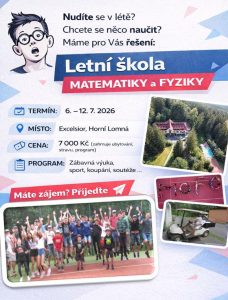 Čekají nás matematické/fyzikální soutěže, řešení kvízů, výroba technických modelů, sportovní vyžití přímo v areálu, turistika.